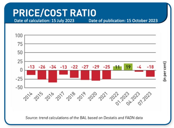 El precio medio de la leche en la granja descendió considerablemente y en julio de 2023 era de sólo 40,63 céntimos por kg. En enero, el precio aún ascendía a 56,93 céntimos y en abril a 45,11 céntimos. Para julio, la relación precio/coste muestra un déficit del 18%, lo que supone un descenso de 37 puntos en comparación con enero, cuando la cobertura de costes era aún del 119%.