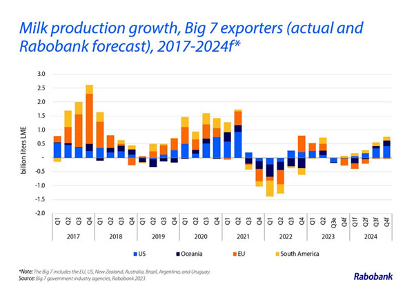 Las perspectivas de suministro de leche de Rabobank para 2024 se han debilitado, y se espera un crecimiento lento en la mayoría de las regiones exportadoras. “El motor de exportación de la oferta de leche nunca llegó a funcionar a pleno rendimiento en 2023 y disminuyó interanualmente en el tercer trimestre en un 0,2%”, dice Michael Harvey, Analista Senior – Lácteos de Rabobank. “Se prevé que la producción de leche interanual de las 7 Grandes regiones exportadoras disminuya hasta el primer trimestre de 2024 antes de volver a ser positiva. En general, se prevé que la oferta de leche crezca un modesto 0,3% para todo el año.”