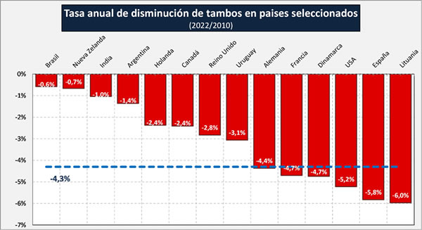 Evolución en la disminución del número de tambos en países/bloques seleccionados