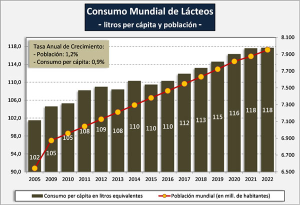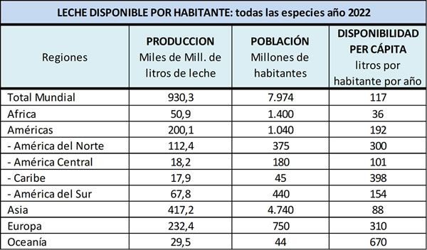 La información en este caso surge de FAO que tiene un valor de producción mundial de leche de todas las especies para el año 2022 levemente inferior al dato de FIL, y la población se tomó sobre el dato de 2021 con un incremento del 1,1% para estimar la población de 2022.