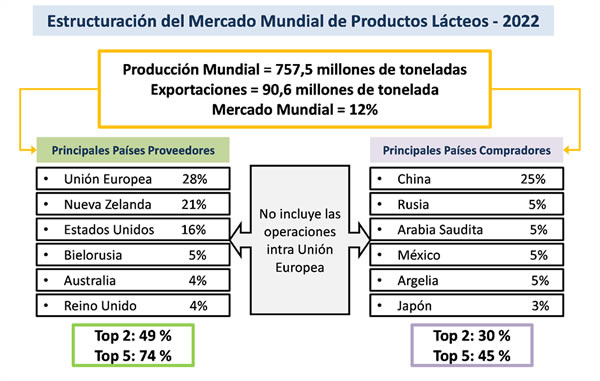 A pesar de tener la producción mundial de leche un volumen significativo, el comercio mundial de dicho producto es relativamente bajo en términos porcentuales. Se encuentra muy concentrada la oferta en pocos países/bloques y hay una cierta atomización en la demanda. Ese volumen pequeño, sumado a la alta relación que tiene con algunas variables de la economía mundial (precio del petróleo, valor del dólar, comportamiento del PBI, etc.), le dan al mercado lácteo mundial su propia característica de alta volatilidad y gran incertidumbre para todos los actores de la cadena de valor.