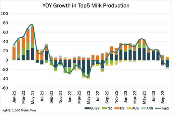 De acuerdo a la Actualización Mundial de Productos Lácteos elaborada por Edwin Lloyd, gerente general de Maxum Foods, poco ha cambiado en términos de los fundamentos de la oferta y la demanda en las perspectivas. Los suministros de leche siguen disminuyendo en la UE y los EE. UU., las existencias se redujeron en general a medida que se acercaba el cierre de 2023, pero la debilidad de la demanda sigue siendo el principal desafío.