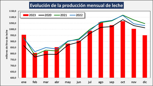 A la vez, la estadística del OCLA abre un signo de interrogación sobre lo que pueda suceder en 2024, ya que la crisis de ingresos para la actividad lechera persiste. De hecho, el gráfico de evolución anual muestra que los descensos de producción han sigo mayores en los últimos cuatro meses del año, lo que muestra el impacto de esta coyuntura.