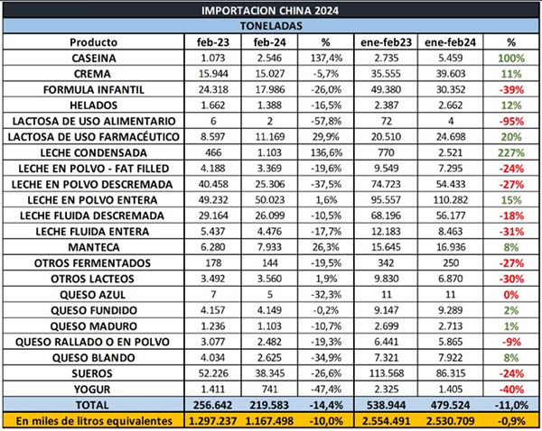 Las importaciones chinas de lácteos retrocedieron 14% en febrero frente a un año atrás, a 218.583 toneladas. La caída en el primer bimestre el año es de 11%.
