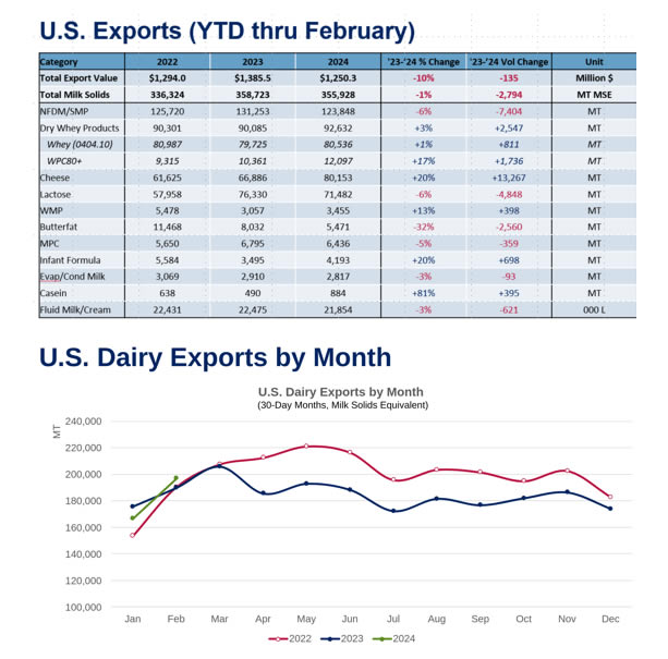 Las exportaciones de lácteos de Estados Unidos aumentaron de manera impresionante en febrero después de 12 meses consecutivos de caídas en el volumen año tras año (YOY). El volumen interanual de sólidos lácteos equivalentes (MSE) creció un 3,7%, estableciendo un nuevo récord en febrero.