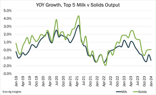 La producción de la UE está aumentando estacionalmente y es probable que crezca este año (una vez que el suelo se seque) con un clima primaveral favorable, los costes de los insumos para piensos y los precios de la leche.