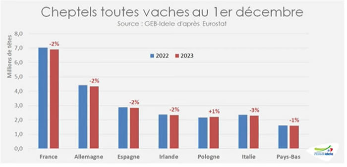En Francia se han visto unos descensos muy pronunciados en la cabaña lechera a finales de 2022 y principios de 2023. Este descenso se ha ralentizado desde finales de 2023, gracias a un precio de la leche que sigue siendo atractivo