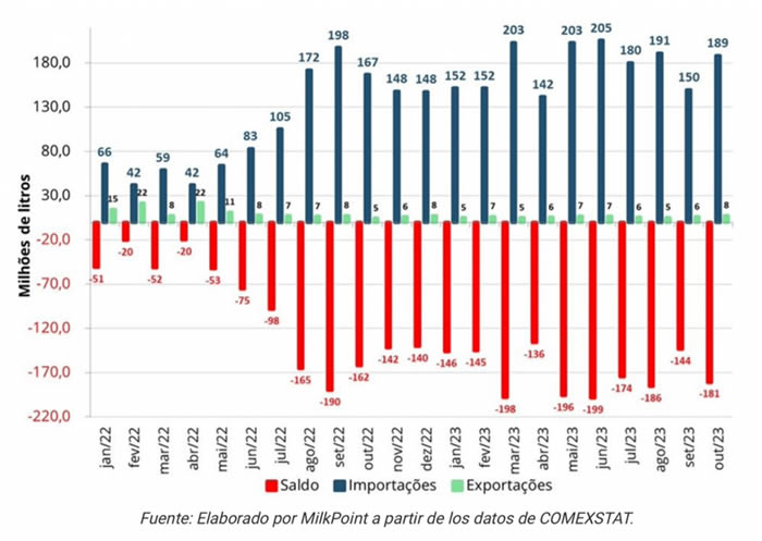 Brasil importa cada año unas 32.000 toneladas de queso, 7.000 toneladas de mantequilla y 75.000 toneladas de leche en polvo. El saldo comercial muestra un déficit en el último mes de 181 millones de litros equivalentes en leche, según los datos publicados por la Secretaría de Comercio Exterior de Brasil (SECEX).