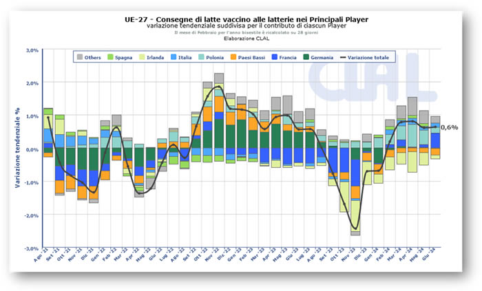 Los datos generales de la UE, aunque positivos, revelan tendencias contrastantes: mientras la producción aumenta en Francia, Polonia e Italia, disminuye en Holanda e Irlanda, desanimadas respectivamente por las limitaciones de las emisiones y los bajos precios al productor y por los pastos no óptimos.