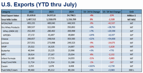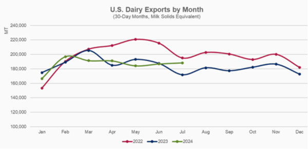 Las exportaciones de productos lácteos de EE. UU. registraron su mes de crecimiento más fuerte en un año y medio en julio, subiendo un 9,6% interanual en términos de sólidos lácteos equivalentes (MSE).