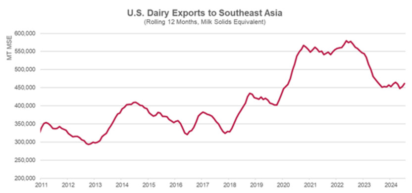 Después de tres años consecutivos de descenso de las exportaciones, dos meses de crecimiento aún no constituyen una nueva tendencia para las exportaciones de productos lácteos estadounidenses al sudeste asiático, especialmente considerando la limitada producción de leche en polvo en los Estados Unidos. Sin embargo, hay factores positivos que están trabajando a favor de los Estados Unidos y podrían indicar un crecimiento futuro, incluso si persisten los desafíos durante los próximos meses.