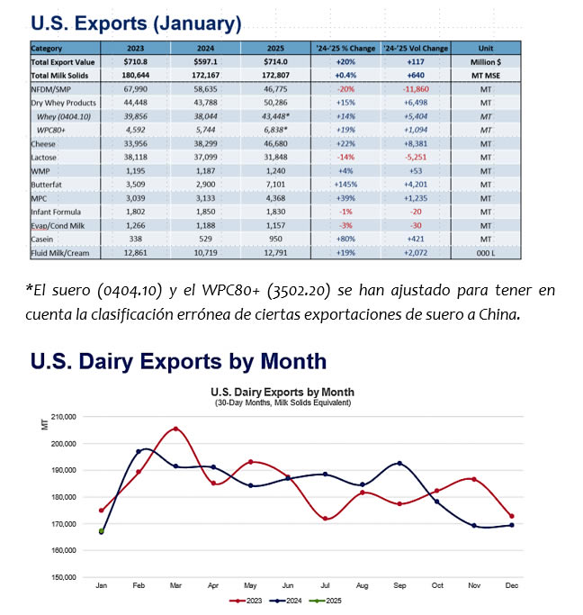 Las exportaciones de productos lácteos de Estados Unidos comenzaron 2025 con ganancias en casi todas las categorías principales de productos. Pero un mal mes para la leche en polvo descremada (NFDM/SMP) y la lactosa limitó el aumento general del volumen al 0,4% (equivalente de sólidos lácteos), en comparación con el año anterior. El valor de las exportaciones estadounidenses interanuales aumentó un 20% hasta los 714 millones de dólares, un récord para enero.