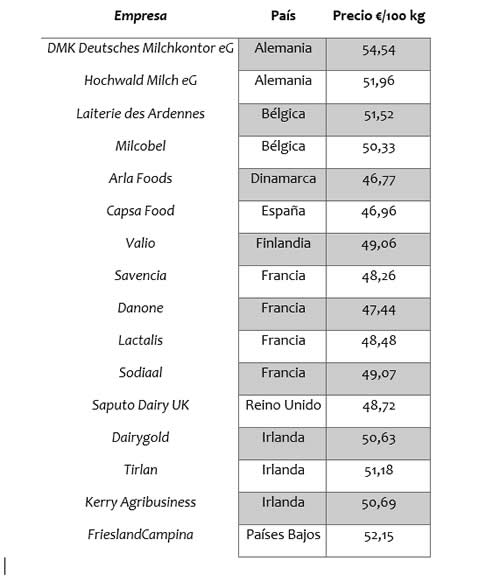 Aquí están algunos de los precios pagados por las principales industrias lácteas europeas: