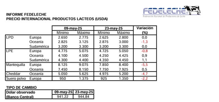El análisis, elaborado por Fedeleche, presenta un panorama actualizado de los precios internacionales de productos lácteos basado en datos de la USDA entre el 09 de abril y 23 de mayo de 2025, además de información relevante sobre tendencias globales de producción.