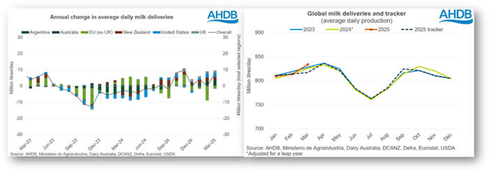 Las entregas diarias en el Reino Unido promediaron 44,2 millones de litros diarios en marzo, un 3,8 % más que el año pasado, lo que equivale a 1,6 millones de litros diarios adicionales. El clima favorable y la situación económica de los productores lácteos impulsaron la producción en el período previo a la descarga de primavera.