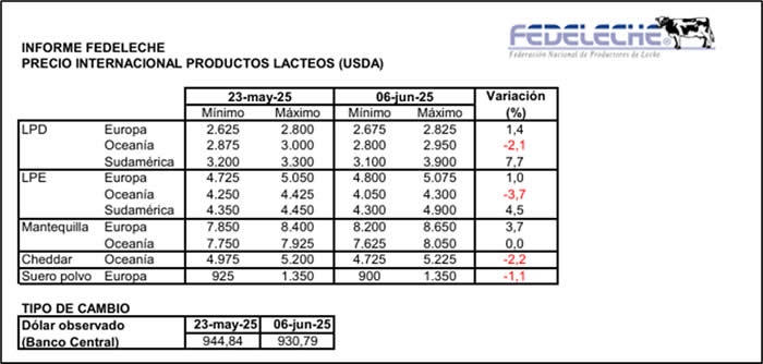 El análisis, elaborado por Fedeleche, presenta un panorama actualizado de los precios internacionales de productos lácteos basado en datos de la USDA entre el 23 de mayo al 06 de junio de 2025, además de información relevante sobre tendencias globales de producción.