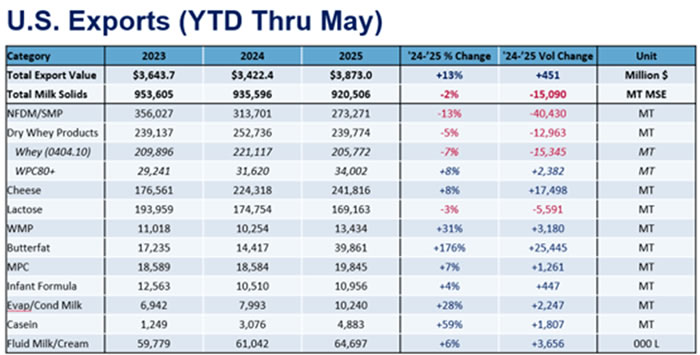 Las exportaciones de queso estadounidense en mayo batieron un récord de volumen en un solo mes, superando las 50.000 toneladas métricas por primera vez. Anteriormente se había informado que las exportaciones de queso estadounidense superaron las 50.000 toneladas métricas por primera y única vez en marzo de 2024, pero con la publicación de las cifras comerciales ajustadas este mes (remontadas a cinco años), el total de marzo de 2024 se redujo a 49.976 toneladas métricas.