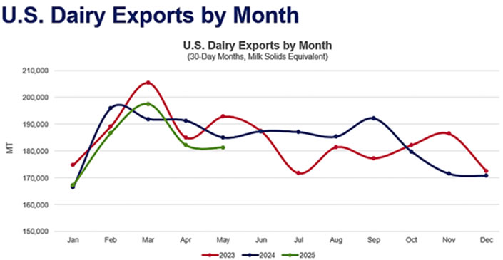 México es el principal destino de las exportaciones de productos lácteos estadounidenses, representando el 29% del comercio en 2024 en términos de MSE. Sin embargo, mayo de 2025 fue un mes a la baja.