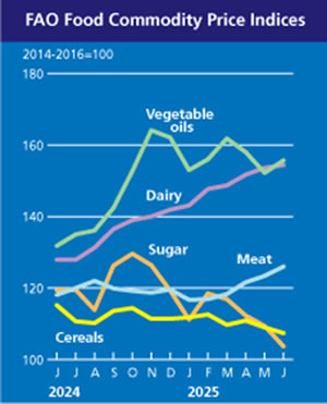 El índice de precios de los alimentos de la FAO* (IPPA ) se situó en un promedio de 128,0 puntos en junio de 2025, un aumento de 0,7 puntos (0,5 %) con respecto a mayo. Si bien los índices de precios de los cereales y el azúcar disminuyeron, estos se vieron contrarrestados por los aumentos en los índices de los productos lácteos, la carne y los aceites vegetales. En general, el IPPA fue 7,0 puntos (5,8 %) superior a su nivel de junio de 2024, pero se mantuvo 32,2 puntos (20,1 %) por debajo de su máximo alcanzado en marzo de 2022.