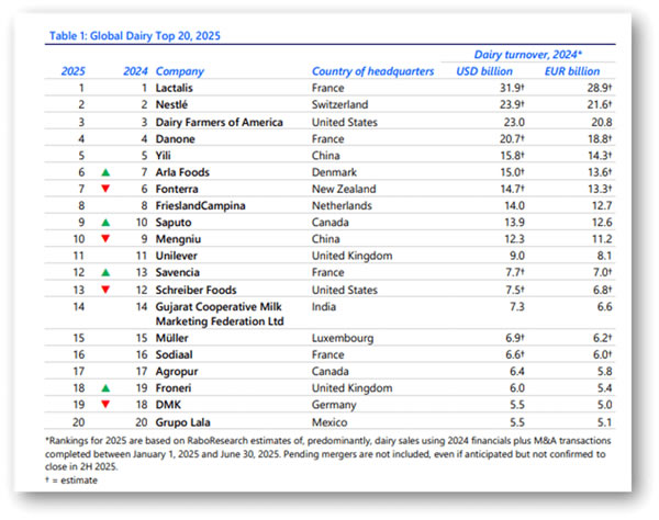 Para 2025, RaboResearch prevé un crecimiento adicional del 0,5 % en la facturación, basándose en la lista actual de las 20 principales, pero esta cifra podría variar significativamente debido a las fusiones y adquisiciones pendientes, las fluctuaciones monetarias y las tendencias regionales de los precios de la leche. Ocho empresas intercambiaron posiciones en la lista de este año.