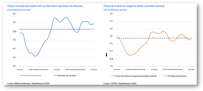 Los precios de la leche experimentaron una moderada disminución ante el aumento de la oferta. Los precios comenzaron a disminuir en el tercer trimestre de 2025, a medida que la oferta aumentó en los principales estados productores. Según CEPEA, el precio promedio de la leche en origen en julio fue de BRL 2,65/litro (USD 0,549/litro), inferior a los BRL 2,82/litro de abril (USD 0,552/litro), ajustado a la inflación. A pesar de la tendencia a la baja, los precios se mantienen relativamente respaldados por una demanda mayor de lo esperado.