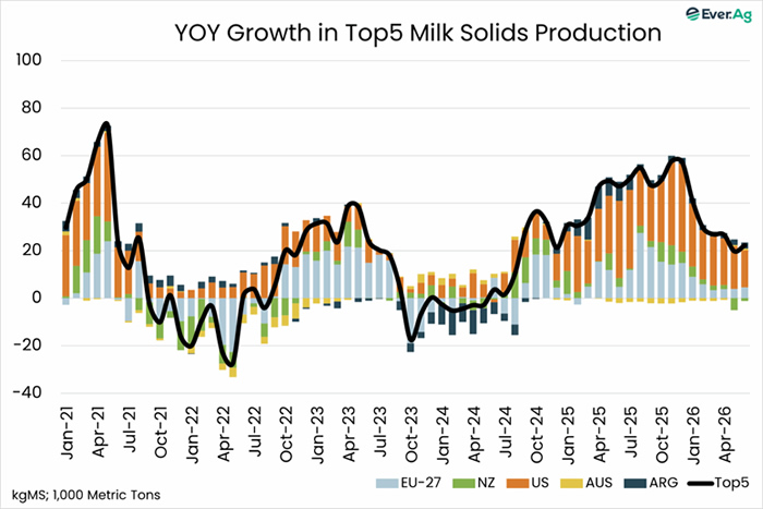 El aumento de los suministros de leche de la UE está siendo impulsado por los buenos precios de la leche, los brotes limitados de enfermedades, un cambio en los patrones de parto y la abundancia de alimentos baratos. Al evitar la sobreproducción de queso, nata y sólidos descremados, los suministros son abundantes, las importaciones de grasa butírica están aumentando y los exportadores de la UE están perdiendo cuotas de mercado de exportación de queso.