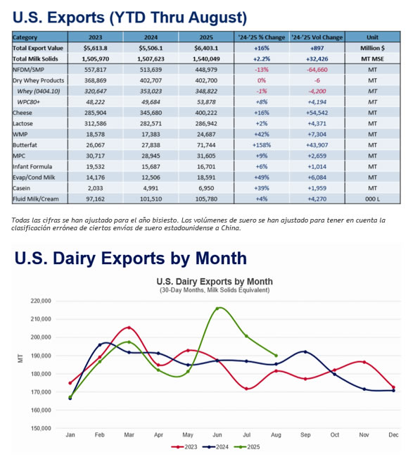 La racha de crecimiento trimestral impulsó ligeramente el crecimiento de las exportaciones de lácteos estadounidenses en lo que va de año (YTD) hasta un +2,2 % en el Mercado Intermedio de EE. UU. En términos de valor, las exportaciones de lácteos estadounidenses aumentaron un 17 % interanual en agosto, hasta los 831,5 millones de dólares, y un 16 % en lo que va de año, hasta los 6400 millones de dólares. Si bien el valor se encamina a acercarse a su récord anual, el aumento de la producción de leche de los principales proveedores mundiales y la consiguiente caída de los precios de las materias primas podrían moderar las ganancias en el cuarto trimestre.
