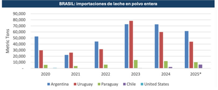 • Leche en polvo entera: sigue siendo el principal derivado importado. La producción local crece marginalmente, condicionada por altos costos internos.