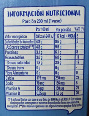 Información nutricional de un brick de leche entera. / Open Food Facts