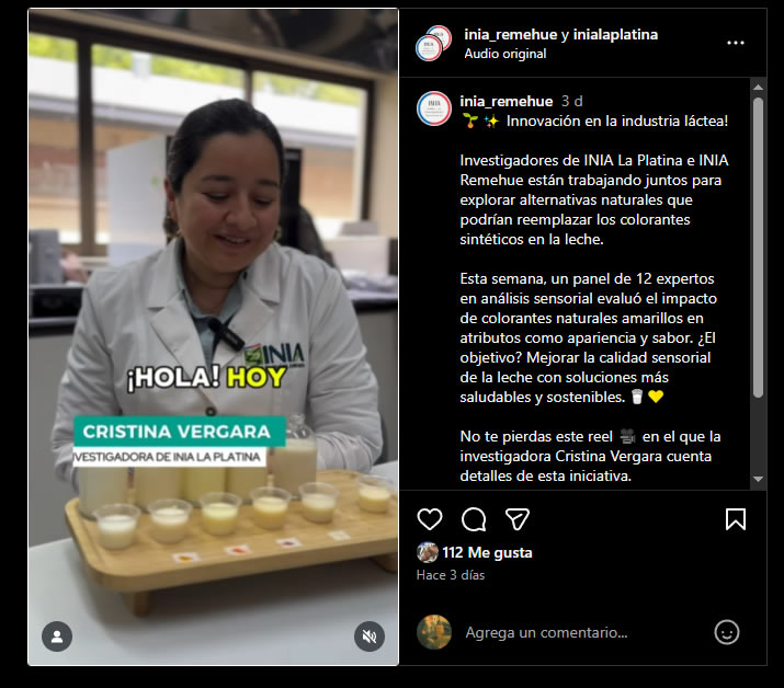 Este estudio forma parte del proyecto colaborativo entre dos centros regionales de investigación, donde INIA La Platina desarrolla aditivos naturales basados en colorantes amarillos y naranjos, e INIA Remehue apoya en la formulación de las leches y en la ejecución de las pruebas con su panel especializado.