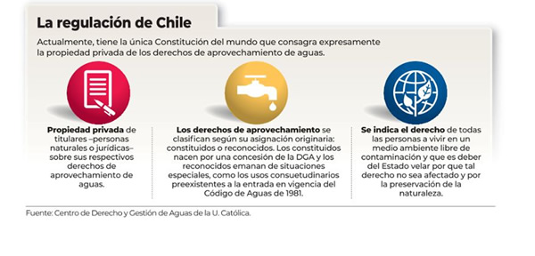Uno de los hallazgos más llamativos para Chile es que su actual Carta Fundamental es la única en el mundo que consagra en forma expresa la propiedad privada sobre los derechos de aprovechamiento de aguas, lo que le da un estatuto jurídico más potente que en otros Estados, aunque también genera críticas en medio del debate por una nueva propuesta de Constitución.