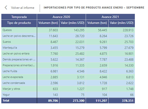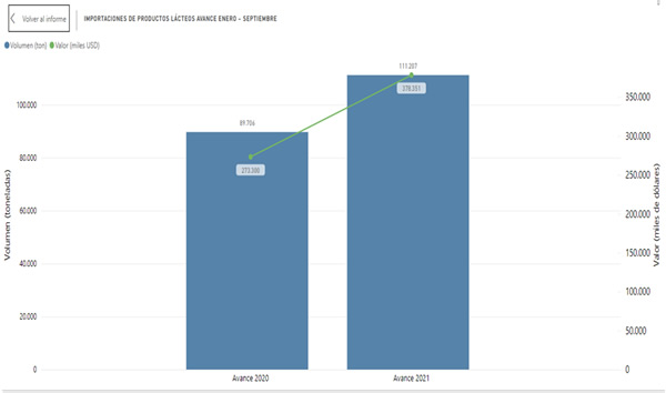 Las compras en el extranjero de productos lácteos siguen presentando cifras históricamente altas, con un aumento en valor de un 38,4% entre enero - septiembre de 2021 frente a igual periodo del año anterior, sumando un total de US$ 378,3 millones.