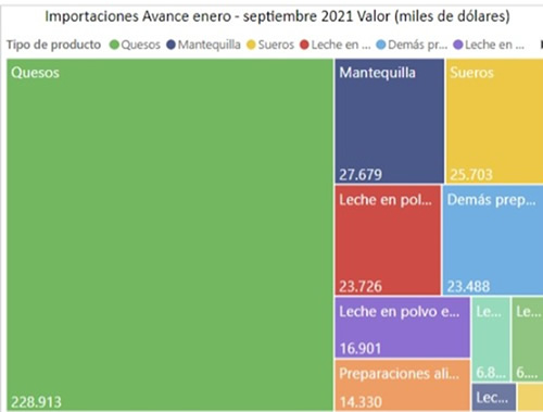 Esta categoría sigue siendo por lejos la más incidente en el total de productos lácteos importados a la fecha, al concentrar el 60,2% del total entre enero – septiembre de 2021.