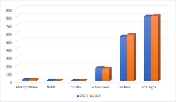 En la región de La Araucanía la recepción de leche retrocedió en un 2,9%, confirmando el comportamiento mixto observado durante 2021, y que supone alcanzar un total de 15,8 millones de litros, lo cual es inferior en 465 miles de litros frente al mismo mes del año anterior.