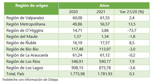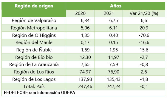 De norte a sur, la producción de leche en la región de Valparaíso anotó un nuevo avance frente al mismo periodo de 2020, esta vez, de un 2,4%, equivalente a un incremento de 1,4 millones de litros, pasando de 60,0 a 61,5 millones de litros. Este último valor supone el 3,5% de la producción nacional.