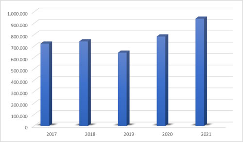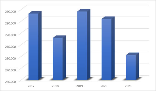 Un comportamiento similar presenta la importación de Leche Entera en Polvo (LPE), cuya participación alcanza un 5,2% dentro del mercado, con un retroceso de un 31,3% en comparación con el año anterior, totalizando 48,9 millones de litros equivalentes. En comparación con 2020 se observa una caída de 22,3 millones de litros.
