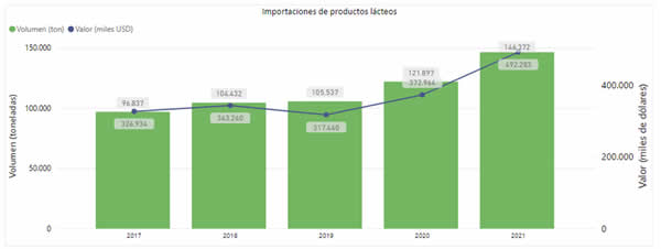 La demanda de productos lácteos en el país es creciente y las compras en el extranjero reflejan esta realidad alcanzando máximos históricos en 2021. En valor las importaciones lácteas presentaron un aumento de un 32,0% frente al año pasado, sumando un total de US$ 492,2 millones.