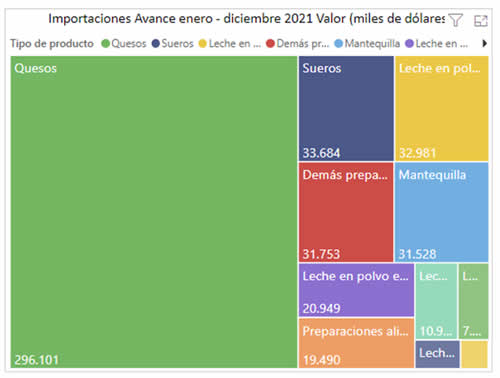 La importación de productos lácteos por categoría fue liderada por los quesos durante 2021.