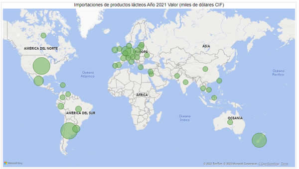 Durante el 2021, Estados Unidos se hizo con el primer lugar entre los cinco principales países de origen de las importaciones de productos lácteos alcanzando una participación de mercado sobre el total del 20,0%, situándose en segundo lugar Argentina, con una participación de un 19,1% y en el tercer sitial Nueva Zelanda, con el 15,6%.