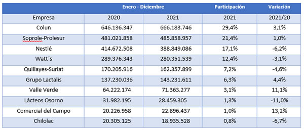En línea con los resultados de los últimos años, la recepción nacional de leche cruda durante 2021 es liderada nuevamente por Colun, cuya participación dentro del total alcanzó un 29,4%, lo que supone una mejoría respecto del desempeño de 2020, cuando concentró un 28,4%.