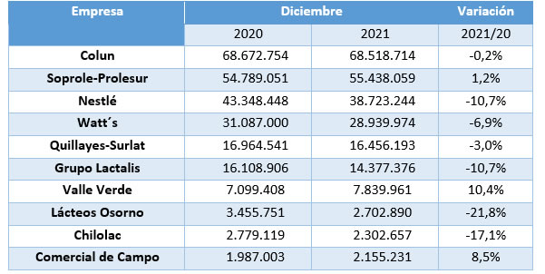 En el duodécimo mes de 2021, Colun anotó una leve caída de un 0,2% en recepción de leche cruda, totalizando 68,5 millones de litros, lo que representa una caída de 154 mil de litros frente a 2020.