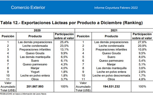 Por categoría, las ‘Demás preparaciones en base a productos lácteos’, lideró las exportaciones entre enero -diciembre de 2021, concentrando una participación de un 27,6% dentro del valor total, seguida por la leche condensada con un 20,9%, las preparaciones infantiles con el 10,8% y el queso gouda que llega al 9,5%y. El suero alcanzó un 8,0% y el queso parmesano un 5,4%. Estos productos representaron 82,2% del total exportado.