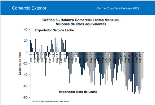 En consecuencia de lo anterior, la balanza comercial de productos lácteos resultó anteriores negativa en 2021 al igual que años, ratificando la condición de Chile como país importador neto de productos lácteos al registrar un déficit en valor de US$ 313,2 millones, y de 764,8 millones en términos de litros equivalentes.