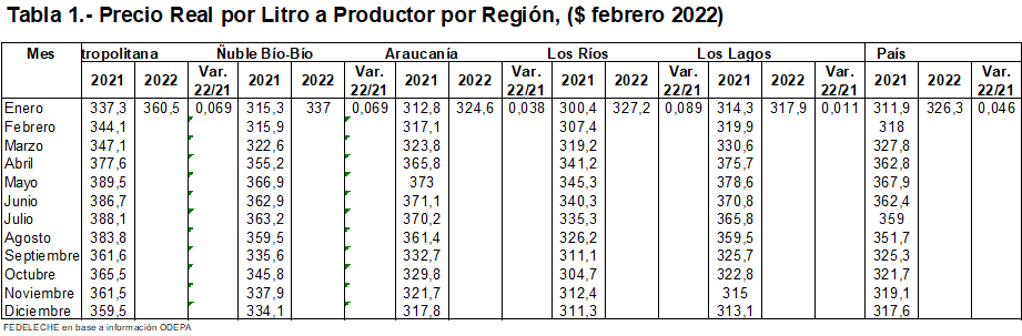En la región de La Araucanía, el precio al productor presentó en enero de 2022 un alza de un 5,0%, escalando $ 11,84 por litro, de $ 312,77 a $ 324,61.