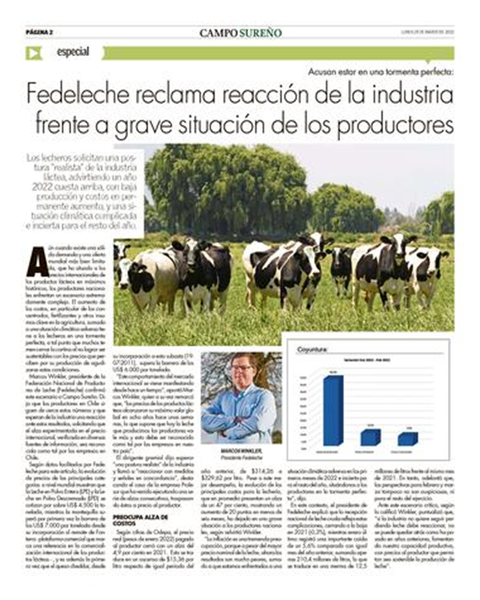 Marcos Winkler, presidente de la Federación Nacional de Productores de Leche (Fedeleche) confirmó este escenario a Campo Sureño. Dijo que los productores en Chile siguen de cerca estos números y que esperan de la industria una reacción ante estos resultados, solicitando que el alza experimentada en el precio internacional, verificada en diversas fuentes de información, sea reconocida como tal por las empresas en Chile.