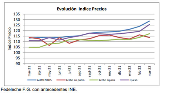 Cabe hacer notar que, en marzo de 2022, entre los productos con mayor incidencia al alza aparece el queso. Por otra parte, dentro de los productos con una mayor incidencia a la baja, dentro de los alimentos, no figura ninguno de los lácteos.