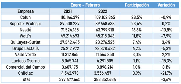 Nestlé Chile, como tercer actor del mercado, registró a febrero de 2022 una participación de un 16,6%, con una recepción de leche cruda que alcanzó de 63,7 millones de litros, lo que supone una caída de un 10,8% en relación al mismo mes de 2021, acumulando un retroceso interanual de 7,7 millones de litros, siendo la baja más importante a la fecha.