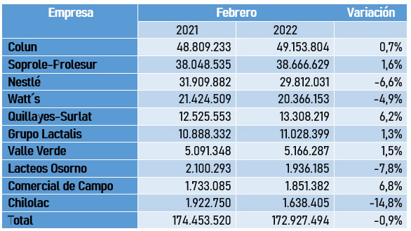 En febrero de 2022, la recepción de leche de la industria láctea mayor alcanzó 172,9 millones de litros, volumen mensual que se traduce en una caída de 0,9% respecto y que se traduce en 1,5 millones de litros menos frente a 2021.