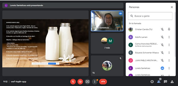 La cita inició con Loreto Santelices, jefa de desarrollo de la marca Chilemilk, quien presentó los avances de la iniciativa y que incluyó, entre otras gestiones, reuniones del gremio en Santiago con ProChile, con representantes de la industria láctea, y de manera virtual, con agregados de las oficinas comerciales y agrícolas de Emiratos Árabes Unidos y Estados Unidos, siendo respaldada por el equipo de Fedeleche.