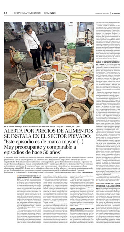 El economista Jorge Quiroz advierte que por las singularidades de la inflación de los alimentos, 'es muy probable que el Banco Central se empiece a equivocar en sus predicciones alegres de cuándo termina la inflación', y plantea que el Gobierno debiera evitar 'hacer tonteras', y sí considerar un sistema de vouchers o bonos para los sectores más vulnerables.